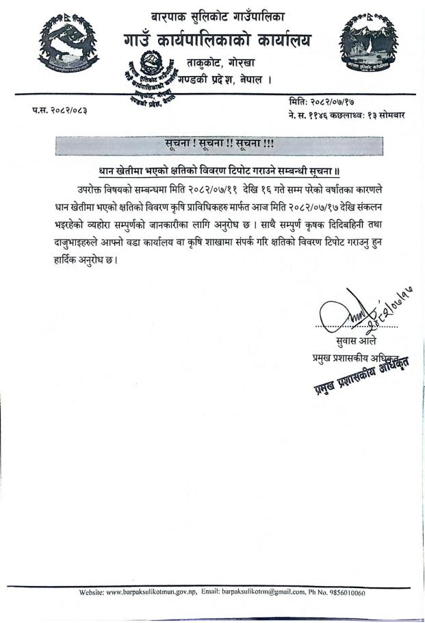 धान खेतीमा भएको क्षतिको विवरण टिपोट गराउने सम्बन्धी सूचना ।।