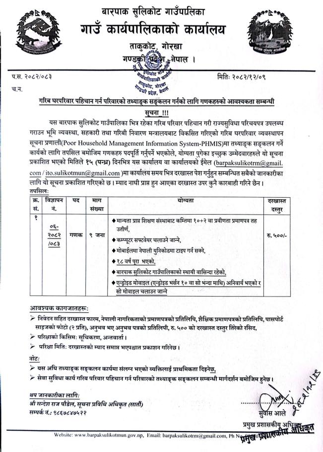 गरिब घरपरिवार पहिचान गर्न परिवारको तथ्याङ्क सङ्कलन गर्नको लागि गणकहरुको आवश्यकता सम्बन्धी सूचना !!!