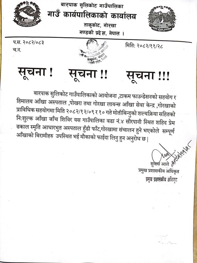 निःशुल्क आँखा जाँच शिविर सञ्चालन सम्बन्धी सूचना ।।