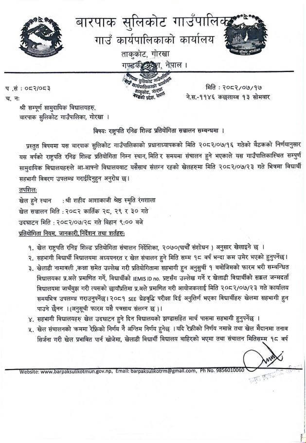 Home » बारपाक सुलिकोट रनिङ शिल्ड प्रतियोगिता सञ्चालन सम्बन्धमा ।।