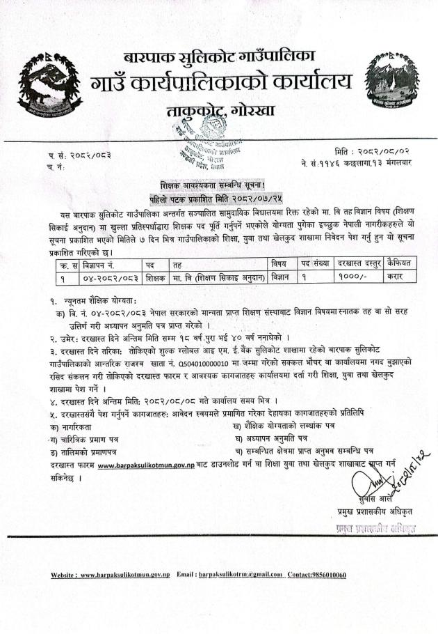 शिक्षक आवश्यकता सम्बन्धी सूचना। दोस्रो पटक प्रकाशित