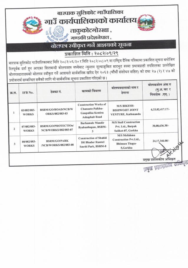 Home » बोलपत्र स्वीकृत गर्ने आशयको सूचना ।।