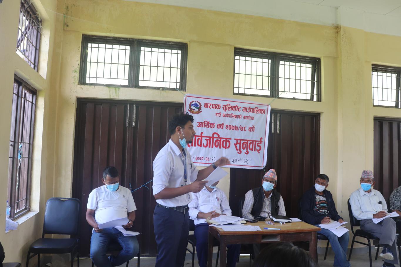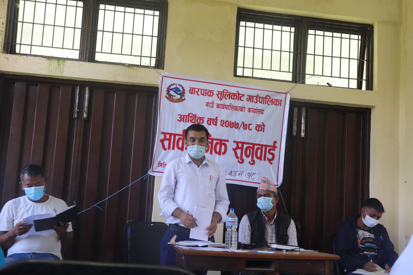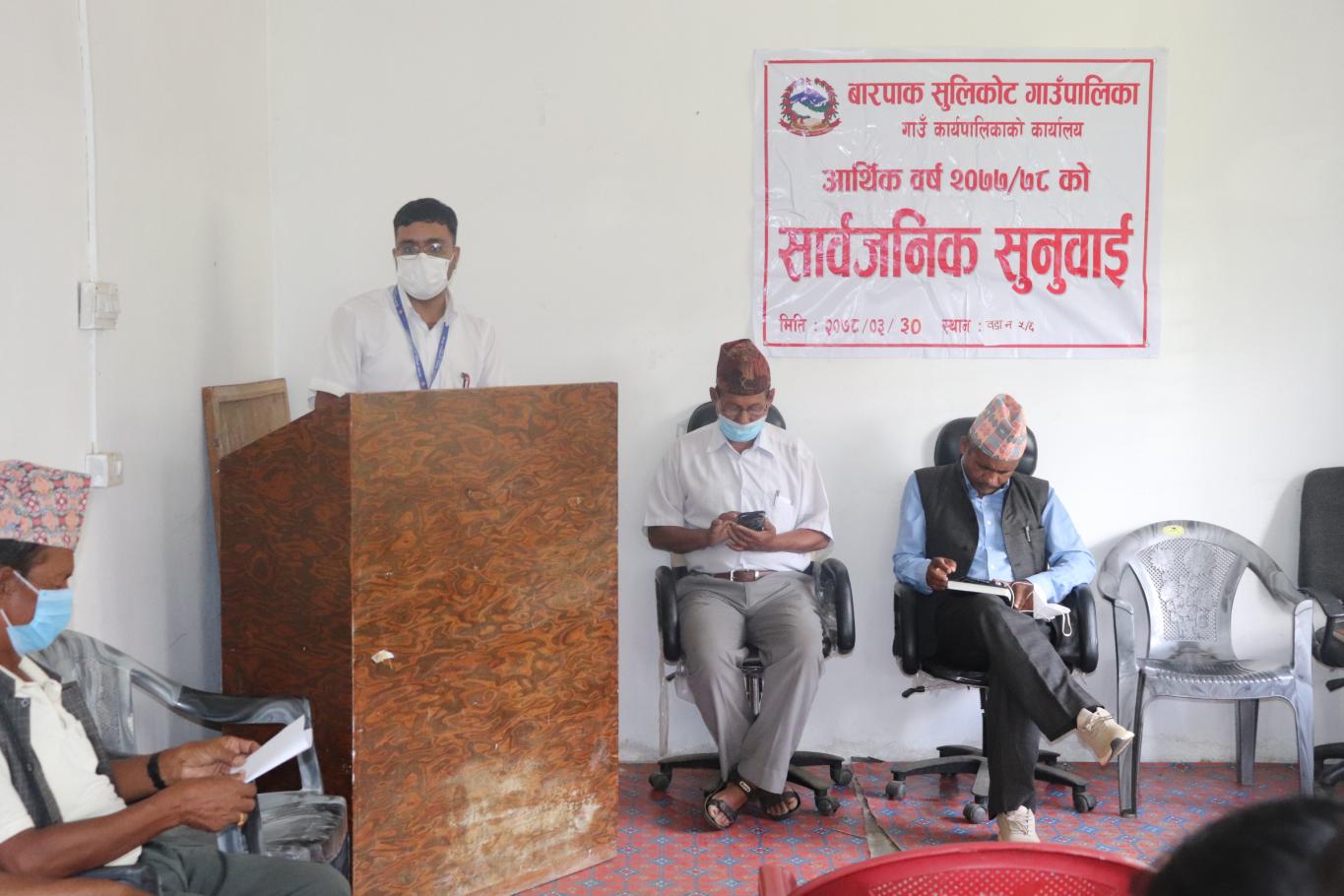 बारपाक सुलिकोट गाउँपालिकाको आर्थिक वर्ष २०७७।७८ मा गाउँपालिका बाट प्रदान गरिएको सेवाका सम्बन्धमा वडा न ७ र ८ को देउरालीमा र वडा न ५ र ६ को तामालाबोटमा सप्पन्न भएको सार्वजनिक सुनुवाईका केहि तस्बिरहरु