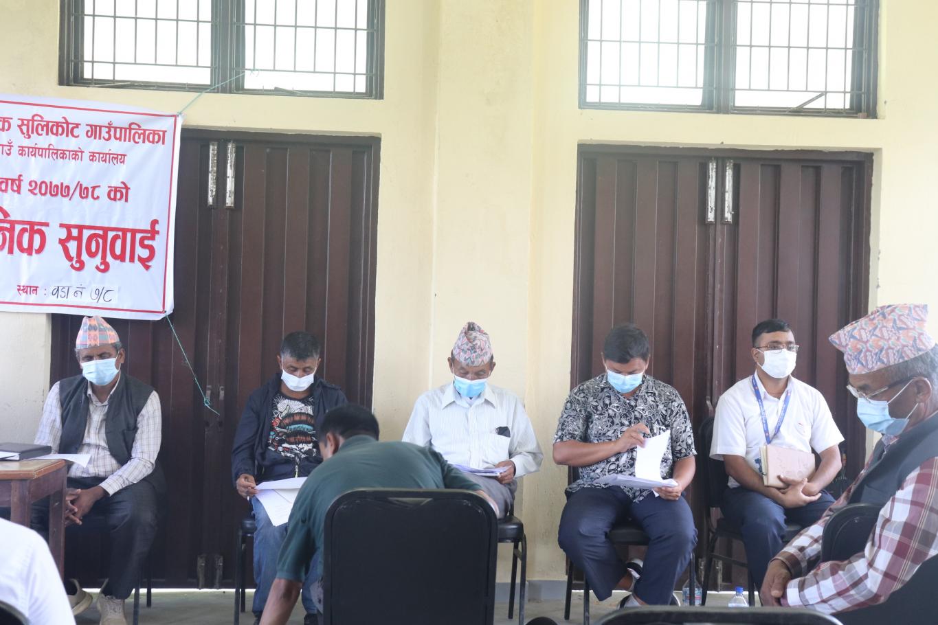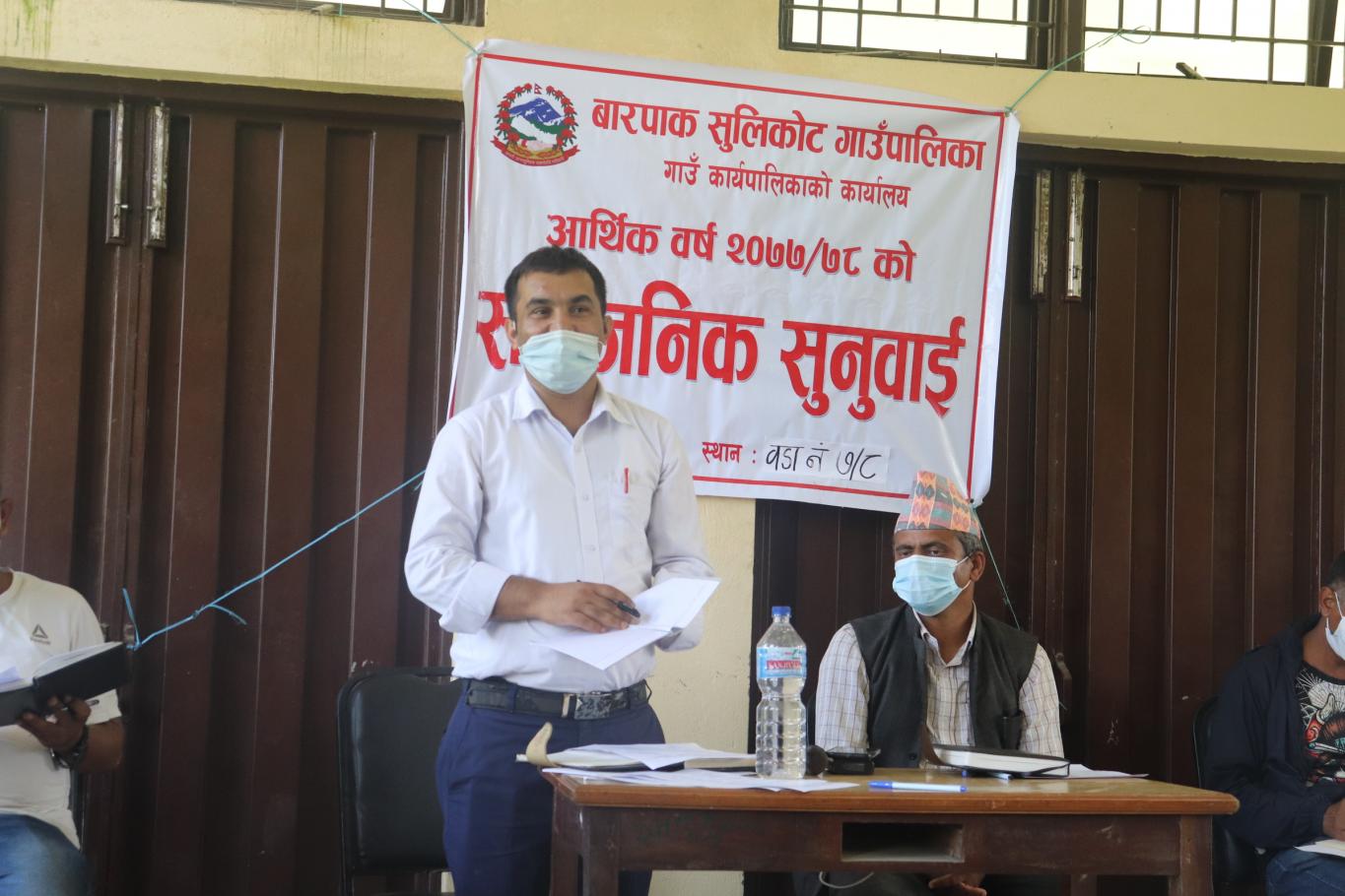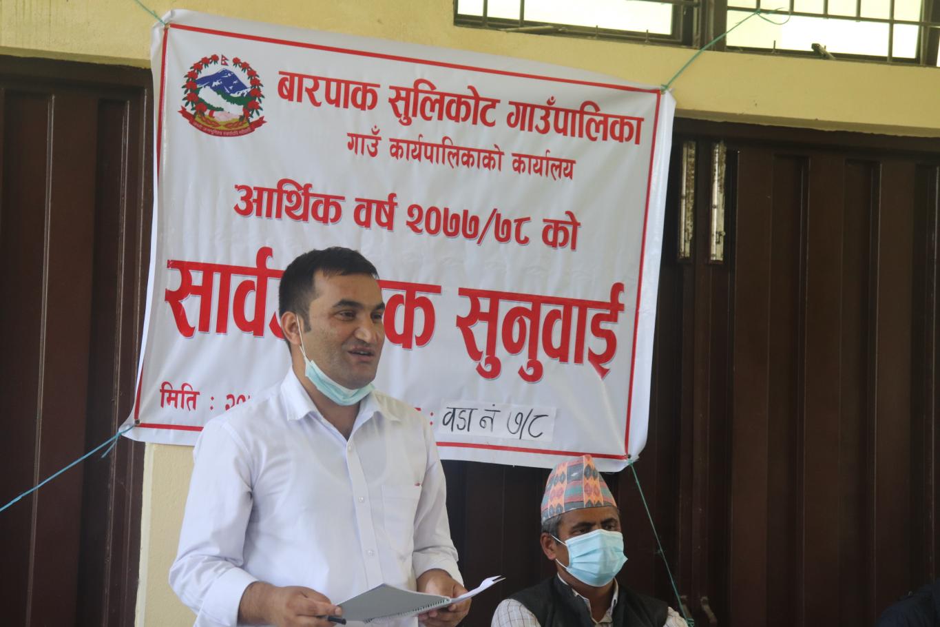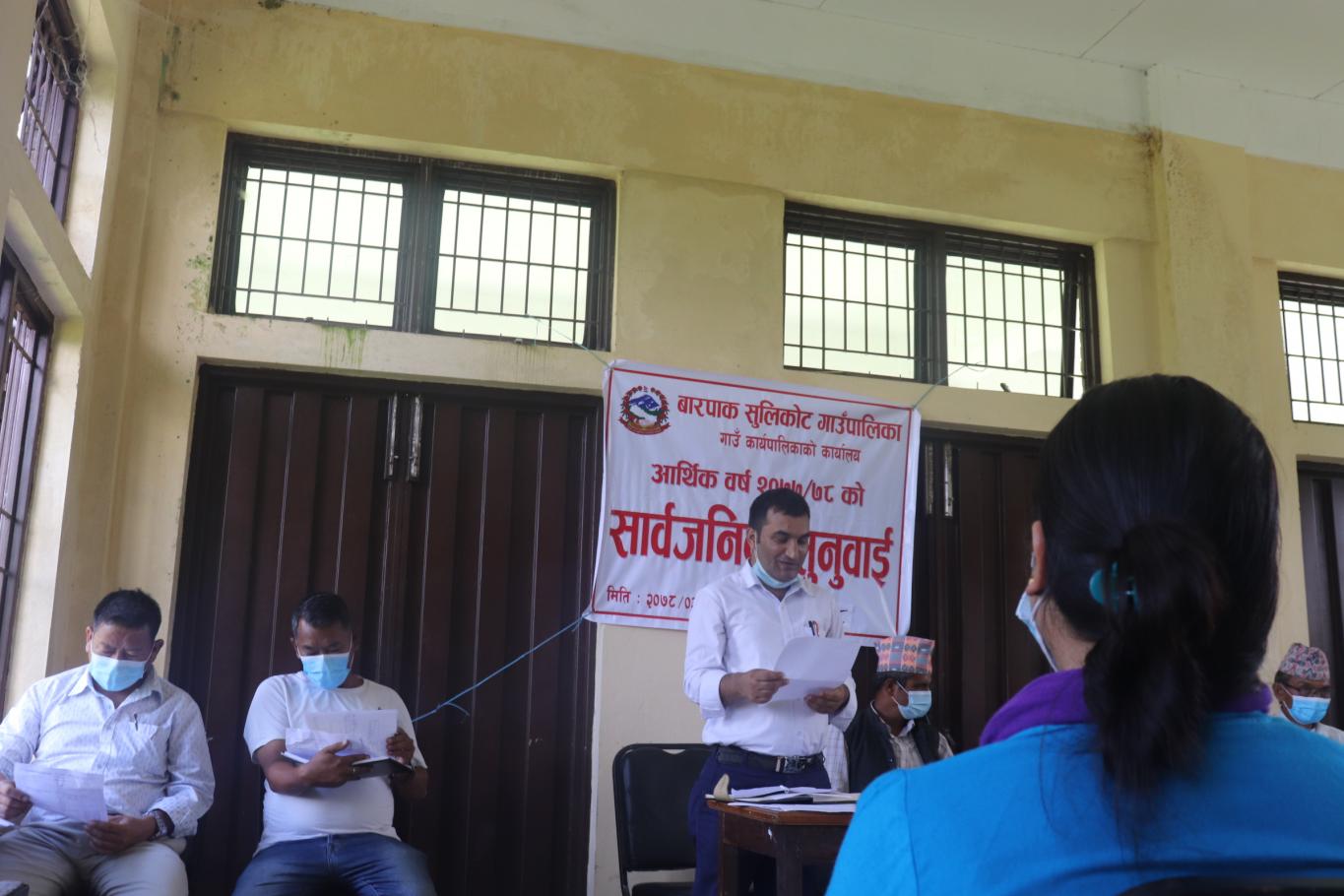 बारपाक सुलिकोट गाउँपालिकाको आर्थिक वर्ष २०७७।७८ मा गाउँपालिका बाट प्रदान गरिएको सेवाका सम्बन्धमा वडा न ७ र ८ को देउरालीमा र वडा न ५ र ६ को तामालाबोटमा सप्पन्न भएको सार्वजनिक सुनुवाईका केहि तस्बिरहरु